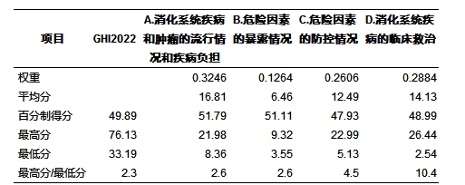 各个省份在消化系统疾病的临床救治和危险因素的防控情况两个维度整体得分相对较低;在消化系统疾病的临床救治方面各省差异最为明显,其次为危险因素的防控情况。