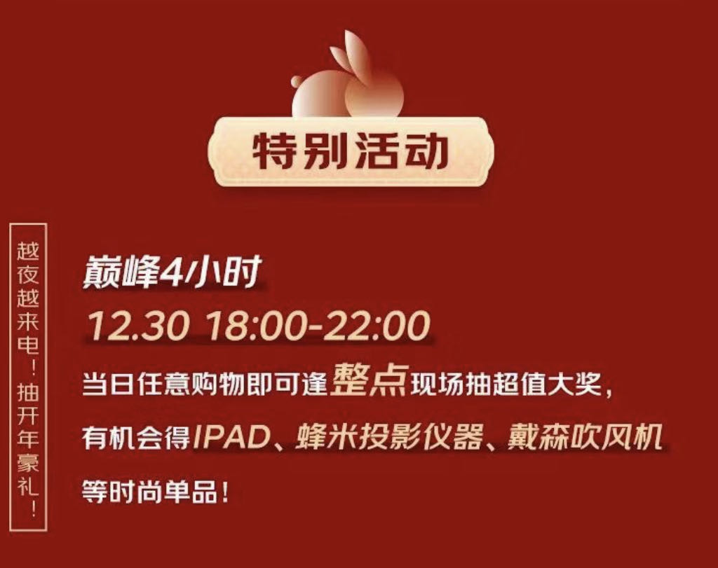 值得一提的是,12月30日消费者在沈阳京东MALL店内任意购物后,即可参与当日晚18:00-22:00的整点现场抽超值大奖活动,IPAD、蜂米投影仪、戴森吹风机等时尚单品等着你,超值豪礼燃爆整个元旦假期。