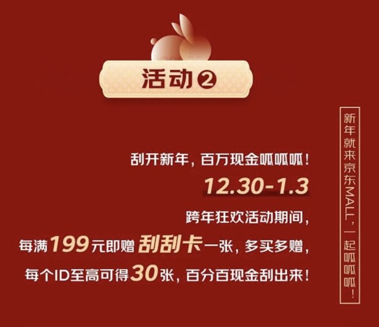 在2022年12月30日—2023年1月3日的跨年狂欢活动期间,沈阳京东MALL发起“刮开新年,百万现金呱呱呱”活动,消费者在店内消费每满199元即获得刮刮卡一张,多买多赠,每个ID至高可得30张,百分百中奖,给新年讨个好彩头!
