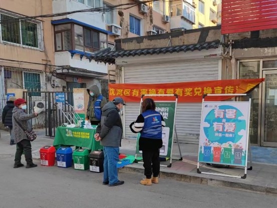 12月6日沈阳市沈河区分类办组织运营企业在皇城街道鹤鸣小区开展“有害换有爱”有害垃圾有奖兑换活动。