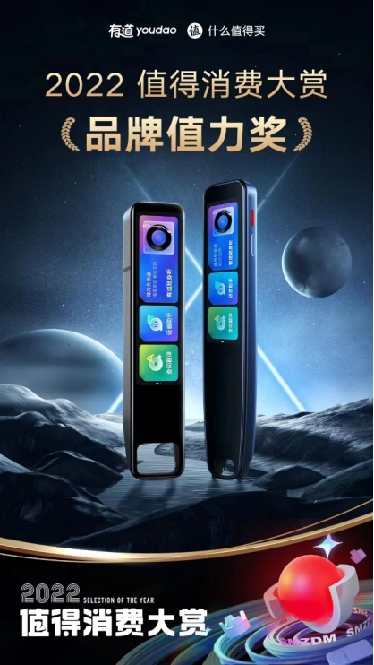 1月6日,科学消费指南“什么值得买”发布“2022值得消费大赏”,以全新发布的“2022值得消费大赏榜单”表彰消费品行业中2022年度优秀的产品与品牌,为用户消费提供高质量的决策参考。网易有道收获“品牌值力奖”和“年度行业影响力奖”两项大奖,其产品矩阵的硬核实力和卓越品质,正在赢得更多的消费者认可,2022年上市的全新一代智能词典笔有道词典笔X5更是在行业影响力奖项中脱颖而出,成为年度爆款。