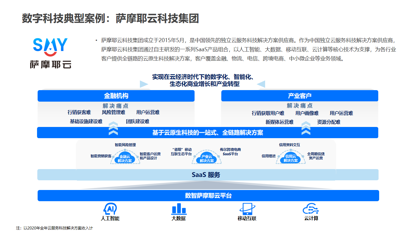 萨摩耶云科技集团通过自主研发的一系列SaaS产品组合,以人工智能、大数据、移动互联、云计算等核心技术为支撑,为各行业客户提供全链路的云原生科技解决方案,客户覆盖金融、物流、电信、跨境电商、中小微企业等业务领域。