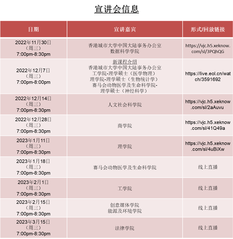 2022年的11月至12月,香港城大已成功举办了多场线上宣讲会,接下来还会有不少场次即将举办。在2023年开篇之际,1月份有理学院宣讲会与赛马会动物医学及生命科学院宣讲会等待你的参与。