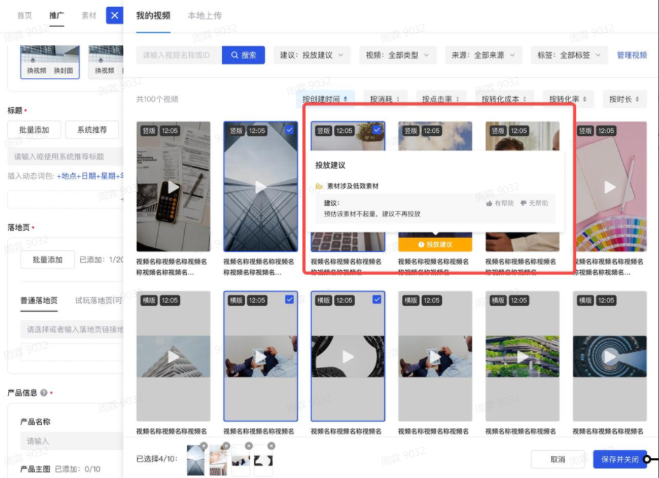 另外,平台对于低效素材(即系统评估视频素材已充分探索但跑量效果极低,且预估未来不起量的素材) 也会提示「低效素材」标签,对极端使用低效素材的计划进行拦截,并建议广告主、代理商替换为新素材或历史跑量较好的素材。广告主应摆脱低效素材,做好轻装上阵的“减法”,实现整体效能优化。