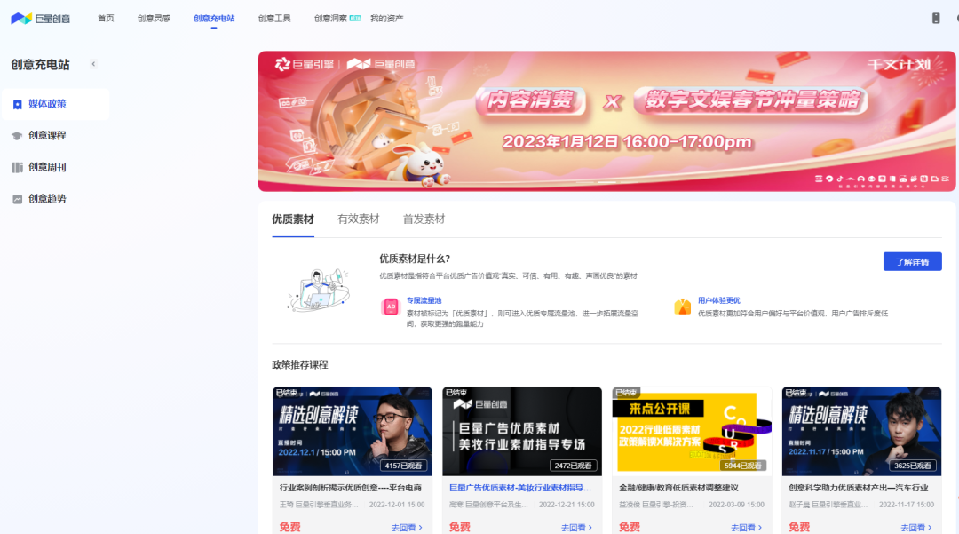 为让各位广告主、创意制作者更好辨别素材质量,及时了解最新媒体政策相关资讯,巨量引擎在巨量创意官网新增了「媒体政策」板块。 帮助广告主获得最新的平台政策信息,了解平台对素材的扶持策略,更合理的安排素材储备。