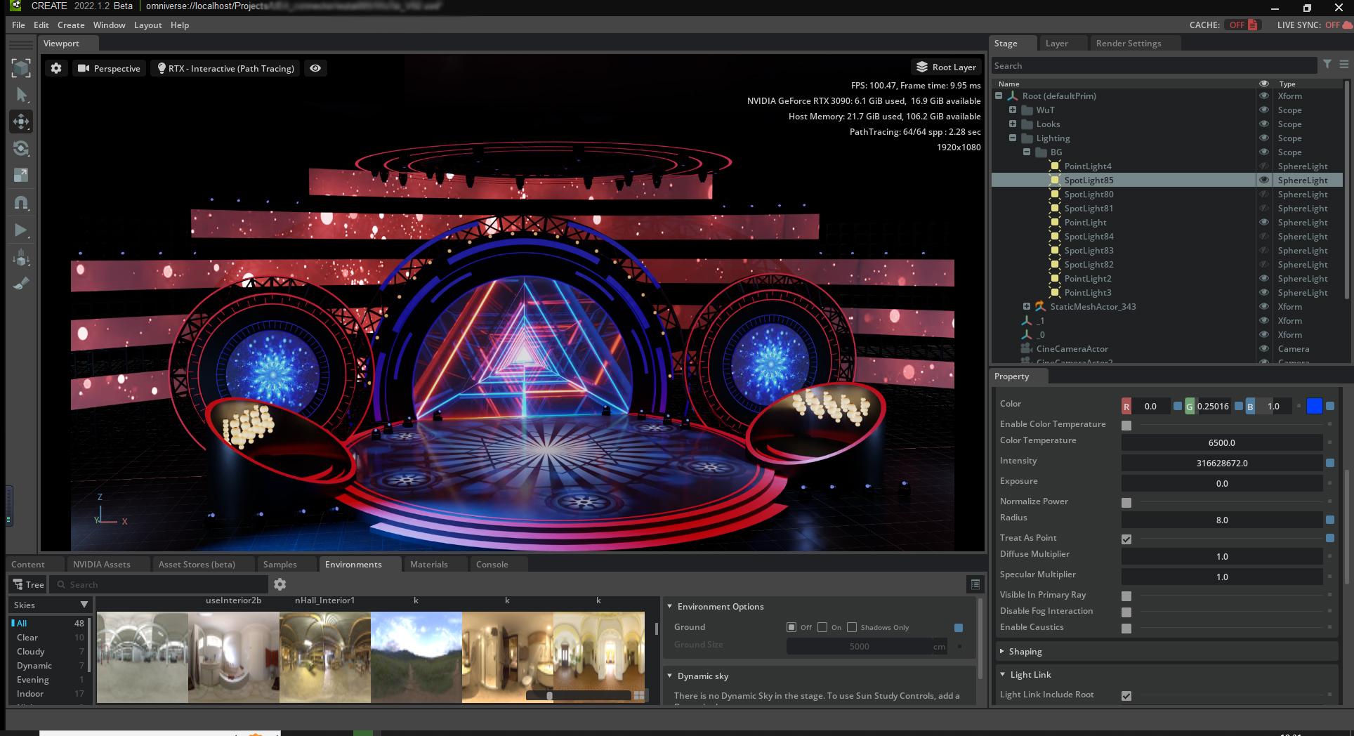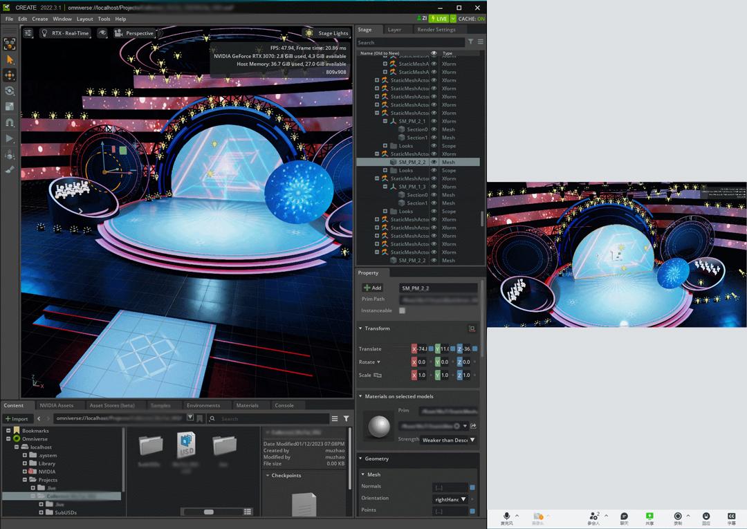制作团队还通过NVIDIA Omniverse Enterprise的强大素材库,拥有了一个可视化的素材预览渠道,从而可以在素材库中快速搜索并且预览各种类型的道具和场景,让团队得以高效搭建视频所需的3D环境。而在场景渲染制作的过程中,NVIDIA英伟达的强项RTX实时追踪渲染技术也提供了进一步的效果加成,配合光照效果,让场景质感得到强化。