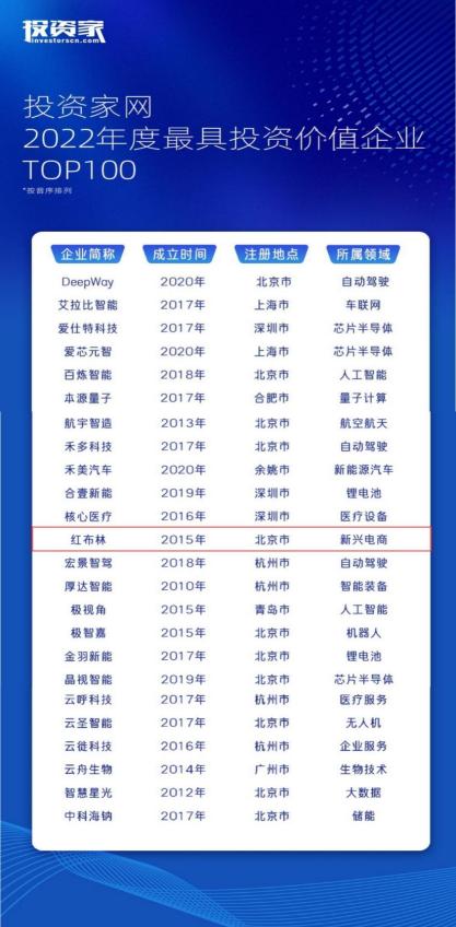 日前,由国内资本与产业创新综合服务平台投资家网发起的“2022中国价值企业榜”重磅发布,榜单分为“2022年度最具投资价值企业”、“2022年度最受投资者关注上市公司”、“2022年度创新企业”三个部分。国内头部循环时尚生活方式平台红布林从众多品牌中脱颖而出,荣登“2022年度最具投资价值企业TOP100”以及“2022年度互联网及移动互联网领域创新企业TOP30”两大榜单。