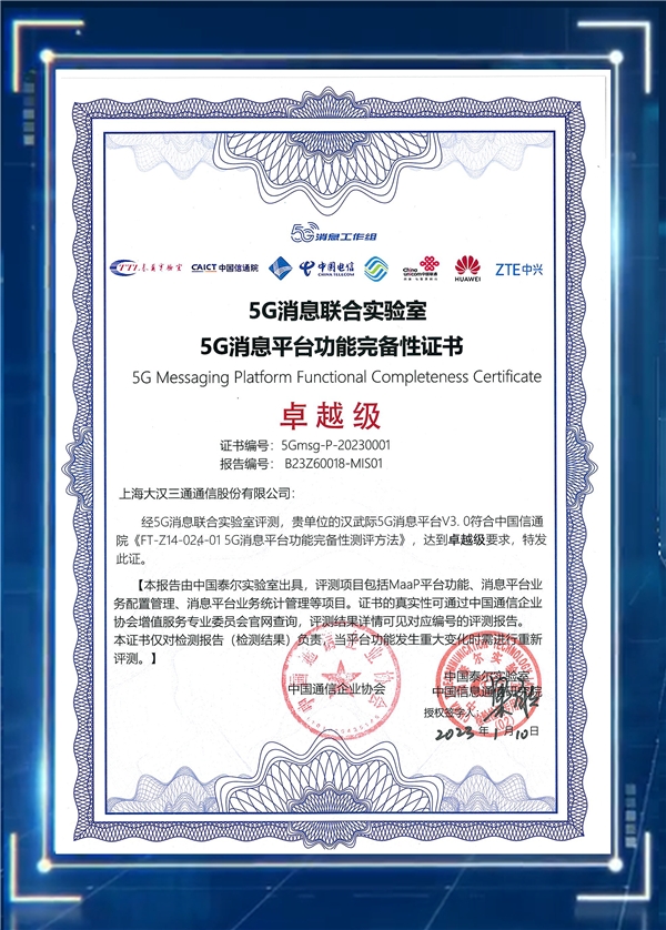 2023年开年,大汉三通喜讯不断,继荣获ICT产业年度多项大奖后,“汉武际5G消息平台”收获中国信通院泰尔实验室2023年1号卓越级认证,这是国内对5G消息平台功能的最高等级认定!