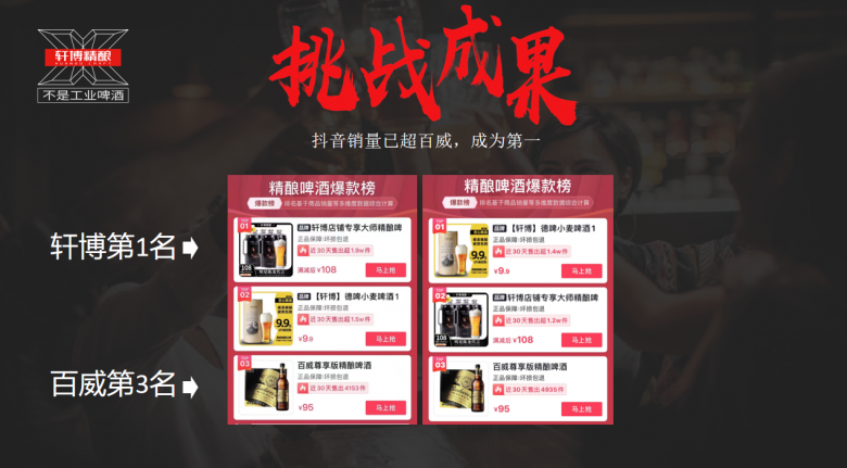由于是精酿等级比百威工业啤酒明显好喝,但价格又比百威工业啤酒只贵15%,切到工业啤酒巨头的软肋,他们无法出同价位的精酿打自己的工业啤酒左右手互博,轩博找到空档承接住了巨大的啤酒消费升级需求,品牌快速获得用户认可,上线一年多就获得近300万用户购买,提前2年完成了在线超越百威的目标,并培养出了自己大批复购的品牌粉丝。