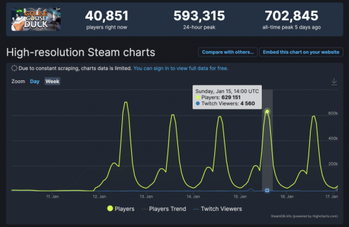目前,这款游戏已吸引大量玩家。根据 SteamDB 的数据(如上图),每天的玩家峰值至少有 55 万人。而且,这款游戏已经冲进 Steam 平台热销榜单的前五名。虽然这样的热度不易复制,但它的玩法场景却可以基于声网 SDK 轻松实现,甚至做出一些差异化的创新。