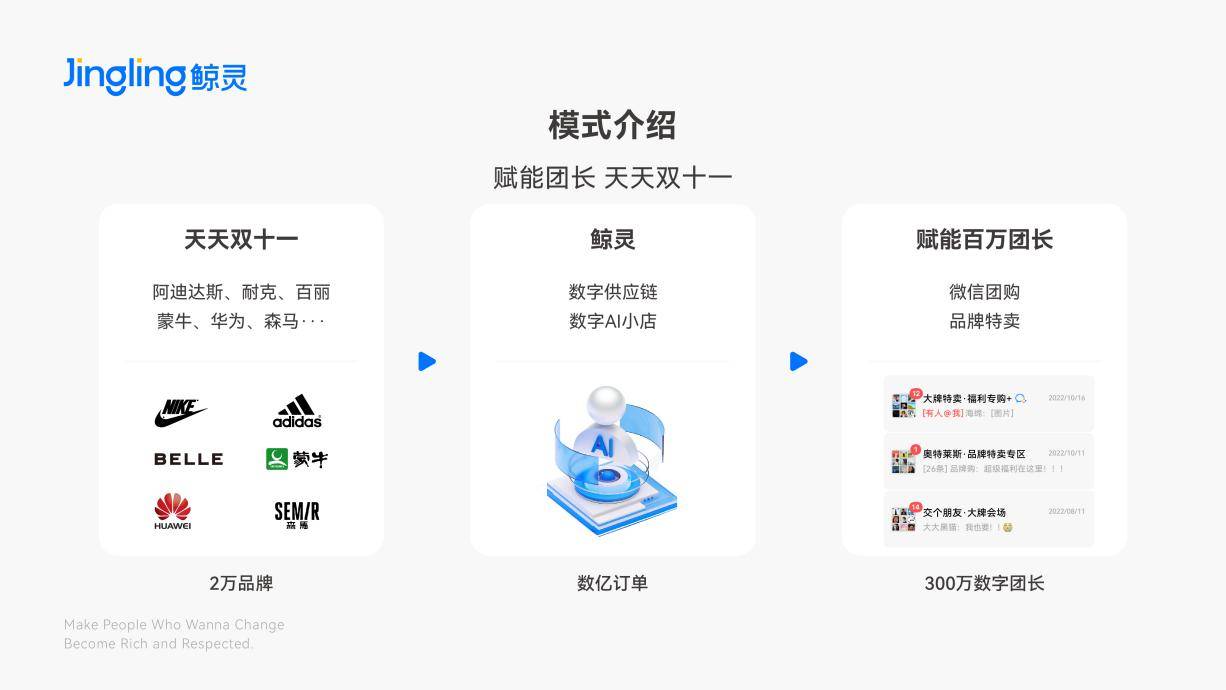 鲸灵集成了AI大数据选品、群货匹配、素材AI、客服AI、物流AI、售后AI、RPA导购等多种技术,为所有团长、品牌商提供全链路数字供应链解决方案,不仅让商家节省流量成本实现规模化增长,也让普通人轻松成为一名运营数字小店的团长,通过种草、溯源、直播、特卖的独特零售模式,实现“天天双十一”。
