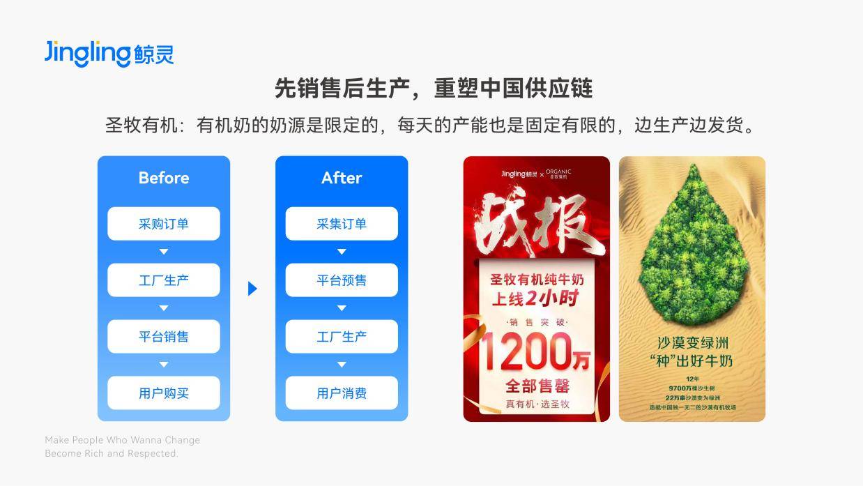 传统的电商只解决了B2C的消费者需求,而鲸灵创新形成的S2B2C模式,增加了“团长”这一个体经营者环节,能够实现对消费者的个性化服务和“以需定产”的逆向匹配。