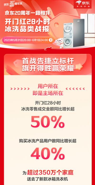 目前,我国冰洗产品保有量已达到一个较高水平,洗衣机百户保有量已经超过100台,冰箱百户保有量更是超过了110台。在市场保有量如此之高的情况下,京东冰洗在刚刚过去的618开门红中,依旧为我们交出了满意的答卷。开门红28小时京东冰洗零售成交金额同比增长超50%,购买冰洗产品用户数同比增长超40%,为超过350万个家庭送去了新款冰箱洗衣机。