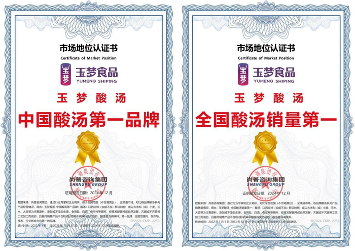 近日,玉梦酸汤获得由知名权威咨询机构尚普咨询集团认证的“中国酸汤第一品牌”和“全国酸汤销量第一”两项市场地位认证。