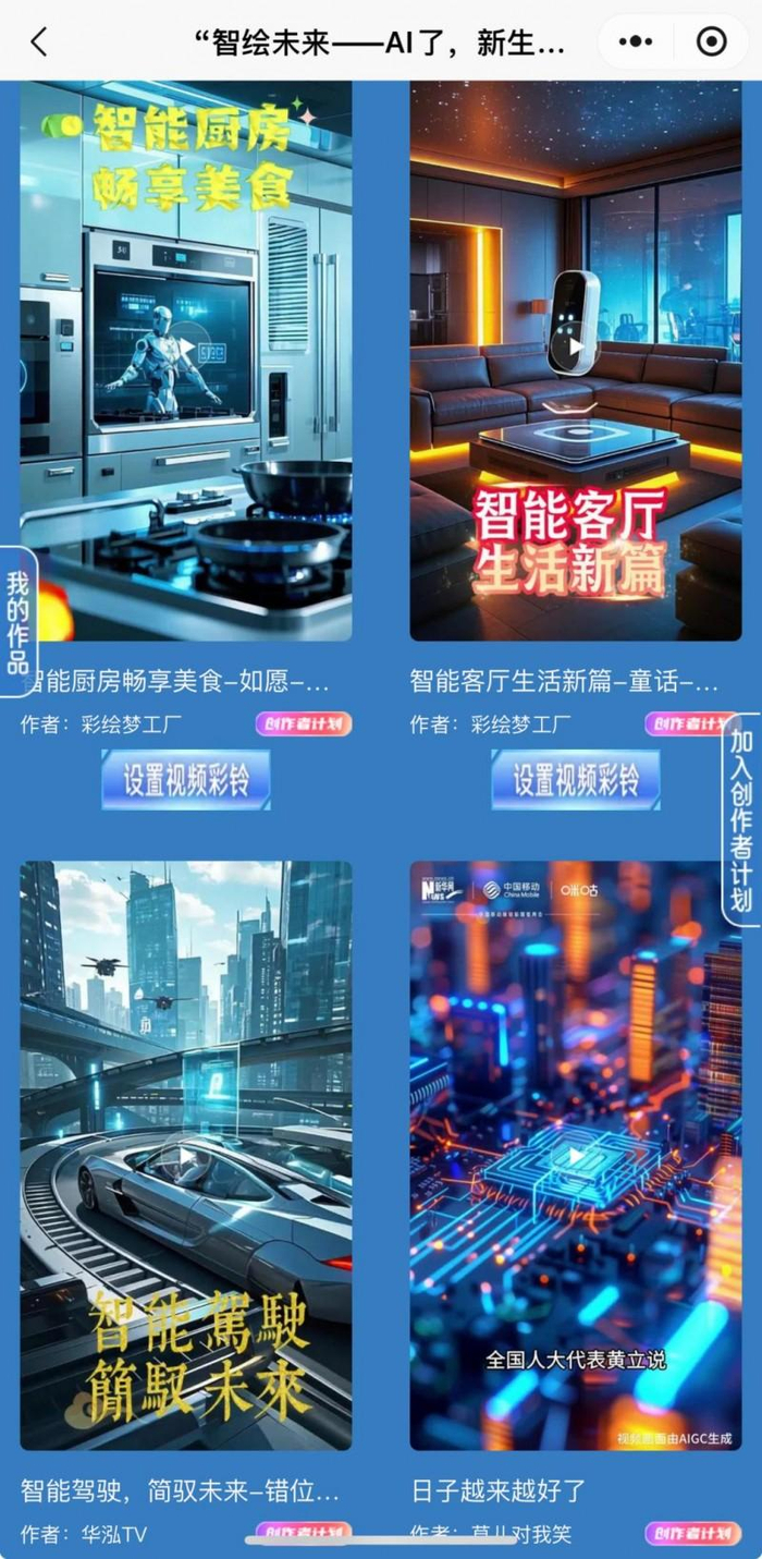 此外,依托AI智创彩铃“通信网”与“互联网”双网传播能力,实现两会内容的跨场景精准传播,覆盖通话等待、社交分享、线上创作等场景。两会期间,中国移动咪咕联合人民阅读,在咪咕彩媒视彩号推出《两会“新”关切》及《听·说》系列节目,对话冯远征、崔丽枝等代表委员,解读委员心声或以青少年视角关注两会要点。内容通过视频彩铃场景加速传播,用户在通话等待的间隙,不仅能接收到最新两会资讯,还能在社交平台上分享定制彩铃,更可以参与AI创作征集活动,用AI描绘心中未来生活的图景,为两会宣传增添更多声音和视角。