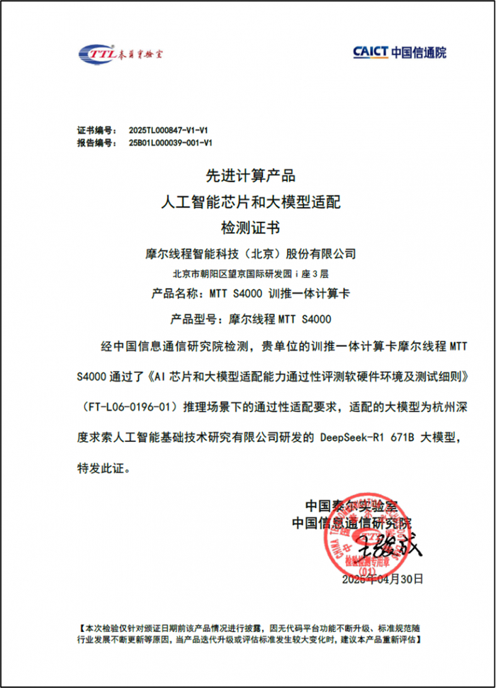 经中国信息通信研究院检测,摩尔线程自主研发的训推一体计算卡摩尔线程MTT S4000和杭州深度求索人工智能基础技术研究有限公司研发的DeepSeek-R1 671B大模型,在推理场景下的适配结果符合“AI芯片和大模型通过性适配要求”,成功通过中国信通院《AI芯片和大模型适配能力通过性评测软硬件环境及测试细则》推理场景验证。摩尔线程MTT S4000可实现正常、稳定运行,满足推理使用需求,符合通过性适配验证条件,并获颁检测证书。目前,摩尔线程系列训推一体计算卡正在开展优化性适配验证工作,相关结果将在检测流程结束后另行公布。
