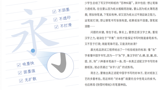 正是对这些纸张性能精益求精的追求,最终让汉字书写在晨光的双倍速滑纸上有了更好的书写体验,真正做到让中国纸更懂中国字。