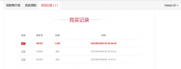 该标的起拍价为800元,参拍需缴纳保证金为100元,每次增价幅度为100元。在拍卖进程中,一共产生了 3轮竞买记录最终以市场价约三折的价格顺利拍出!