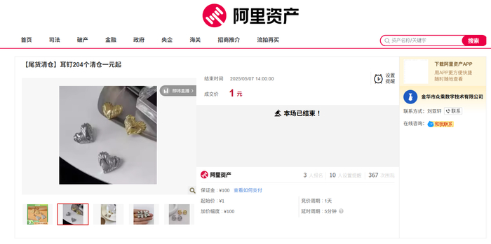该标的起拍价为1元,参拍需缴纳保证金为100元,每次增价幅度为100元。最终,有买家幸运捡漏,以1元的价格,成功竞得该标的全部物品,将204个耳钉收入囊中!