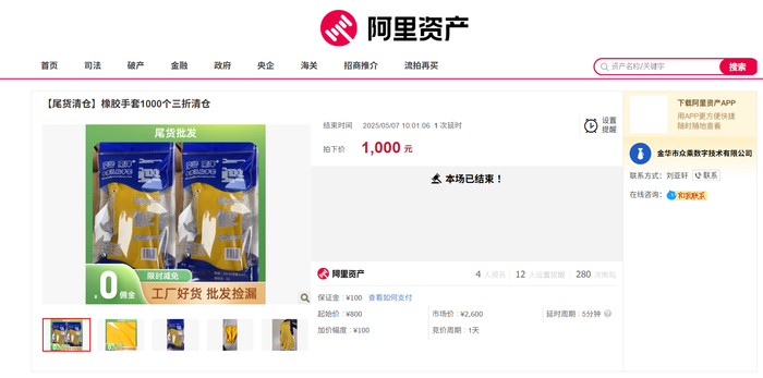 本次第二个成功拍出的标的是橡胶手套1000个三折清仓。