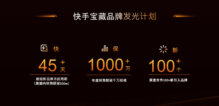 为丰富平台供给生态,快手电商还推出“快手宝藏品牌发光计划”,助力新品牌缩短冷启周期,在45天内实现销售额破500万,年度销售额突破1000万,计划深度合作超100个新引入品牌,推动扩充平台优质供给,放大爆品效应。