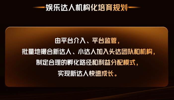 在娱乐达人的电商转型过程中,达人流量增长慢、供应链薄弱,机构新人孵化成本高、培养路径不明确、招募范围偏私域等问题成为普遍痛点。对此,快手电商提出“娱乐达人机构化培育规划”,由平台介入、平台监管,批量地撮合新达人、小达人加入头达团队和机构,制定合理的孵化路径和利益分配模式,实现新达人快速成长。
