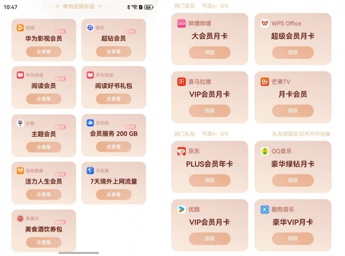 领取方式超简单!华为Pura X新机到手后,用户只需登录华为账号,在手机桌面右滑进入负一屏,点击“鸿蒙有礼”即可领取。权益内容更是诚意满满:华为视频、华为音乐、华为主题等多款华为应用会员,天际通7天境外上网流量以及莫塞尔商城200元美食酒饮券包统统免费送。登录华为账号的第9天,还能解锁哔哩哔哩大会员月卡、WPS超级会员月卡、芒果TV、京东PLUS会员年卡等热门平台会员,以及100元元服务优惠券和华为钱包交通卡激励金,福利拿到手软!