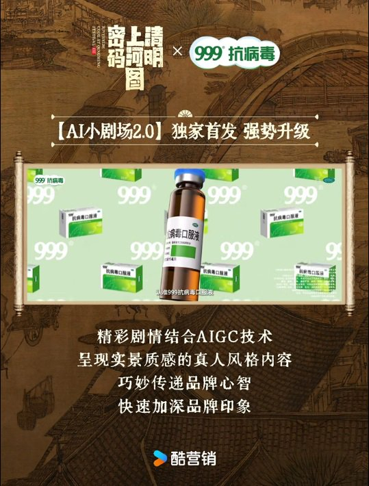 AIGC广告借助前沿技术,通过框内广告展示形式的创新,让品牌信息丝滑融入剧情内容,赋予品牌独特记忆点。999抗病毒携手《清明上河图密码》大剧创新资源「AI小剧场2.0」,通过AIGC技术呈现实景质感真人风格内容,在用户心中烙下“早早抗病毒,认准999抗病毒口服液”的品牌心智。