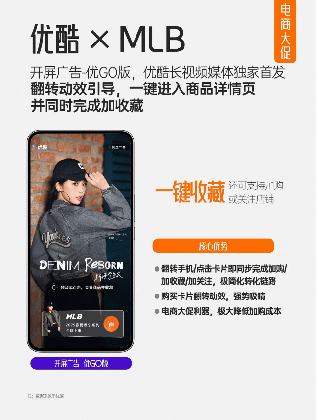 MLB在品牌代言人虞书欣大剧《嘘,国王在冬眠》热播期间,结合优酷独家首发吸睛产品「开屏广告-优GO版」,推出MLB品牌定制翻转动效,以个性化、新鲜感十足的形式引导用户一键跳转品牌天猫官方旗舰店及自动收藏,大幅提升收藏转化效率。