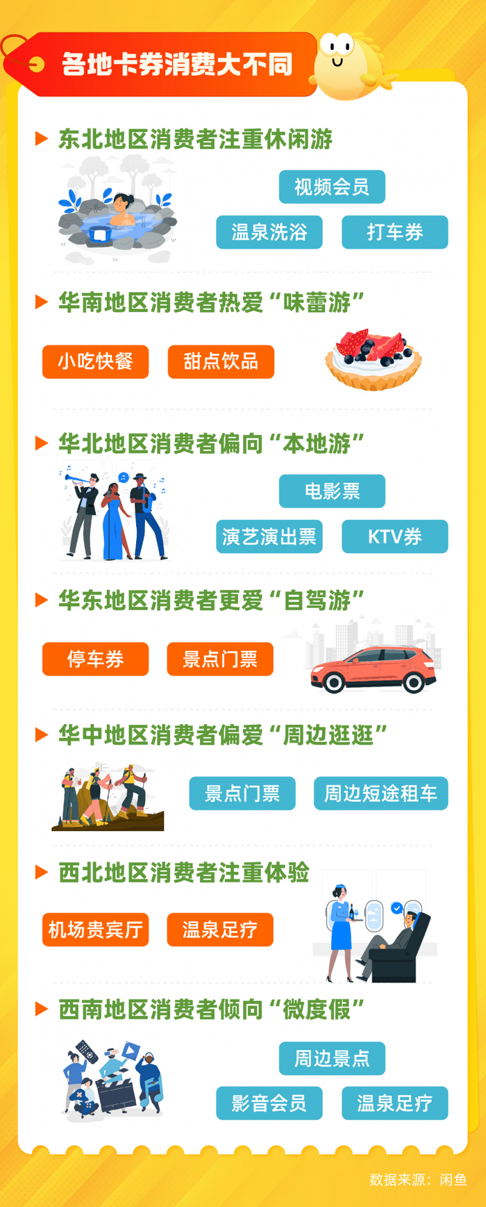 据悉,闲鱼上的卡券消费主力为一二线城市的18-35岁的青年群体,从各地区用户卡券消费情况来看,五一期间,各地消费者的偏好也大有不同,有以休闲娱乐为主的“松弛游”,有倾向于就近走走逛逛、追求身心放松的“微度假”,还有积极探寻本地美食、发掘所在城市Citywalk新路线、打卡各类演出表演的“本地游”等。
