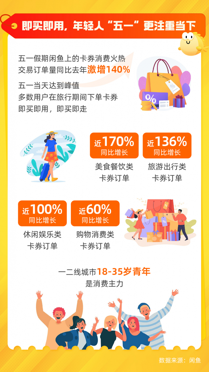 五一小长假收官,闲鱼发布了最新的卡券消费数据,呈现假期消费者出游趋势。数据显示,五一期间卡券消费火热,订单同比激增140%,尤其在五一当天达到了峰值,其中,美食餐饮类订单同比增长最高,达到了170%,旅游出行类、休闲娱乐类增长也均超过100%。