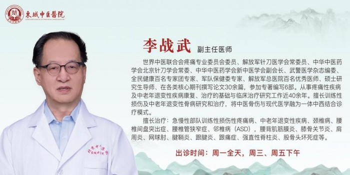 李战武,东城中医医院特聘专家,副主任医师,出诊时间:周一全天,周三、周五下午。世界中医联合会疼痛专业委员会委员、解放军针刀医学会常委员、中华中医药学会北京针刀学会常委、中华中医药学会新中医学会副会长、武警医学杂志编委、全民健康百名专家团专家、军队保健委专家、解放军总医院百名优秀医师、硕士研究生导师、在各类核心期刊撰写论文30余篇,参加专著编写6部。从事疼痛性疾病及中老年退变性疾病康复、治疗的基础与临床治疗研究工作近40余年。擅长训练性损伤及中老年退变性骨病研究和治疗,将中医骨伤与现代医学融为一体中西结合诊疗模式。擅长治疗:急慢性部队训练性损伤性疼痛病、中老年退变性疾病、颈椎病、腰椎间盘突出症、腰椎管狭窄症、邻椎病(ASD),腰背肌筋膜炎、膝骨关节炎、肩周炎、网球肘、腱鞘炎、跟腱炎、跟痛症、强直性脊柱炎、股骨头坏死症等。