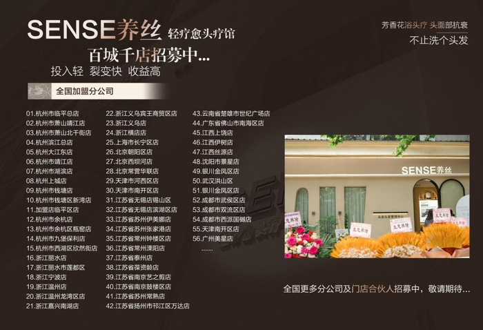 头疗养发行业正值黄金窗口期,SENSE养丝以“轻资本、重体验、强赋能”模式,为创业者开辟低风险赛道。若您期待在千亿蓝海中抢占先机,欢迎到“养丝国际”官微咨询,开启属于您的头疗事业!