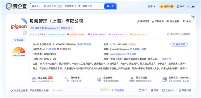 爱企查APP显示,贝亲品牌所属企业为贝亲管理(上海)有限公司,注册资本200万美元,法定代表人兼董事长为周剑峰。