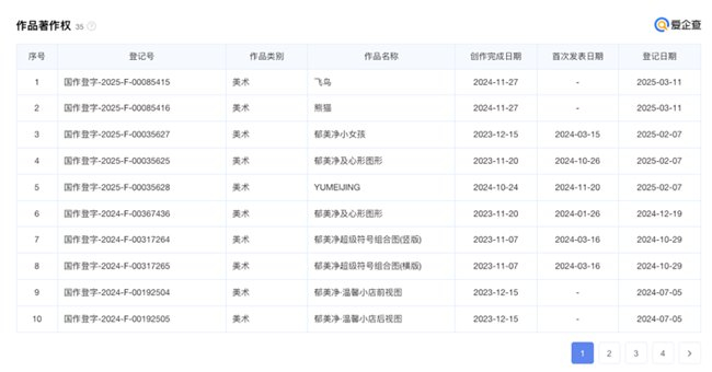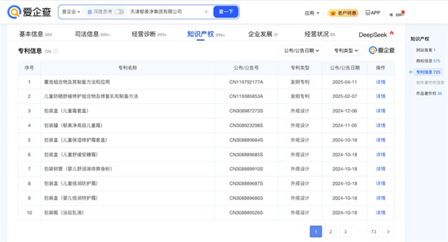爱企查APP显示,郁美净关联企业为天津郁美净集团有限公司,注册时间2000年6月,注册资本4102.15万元。专利信息显示,截至目前,天津郁美净集团有限公司已申请725项专利,其中绝大多数为外观设计专利。此外,作品著作权信息显示,该公司已登记35项著作权。
