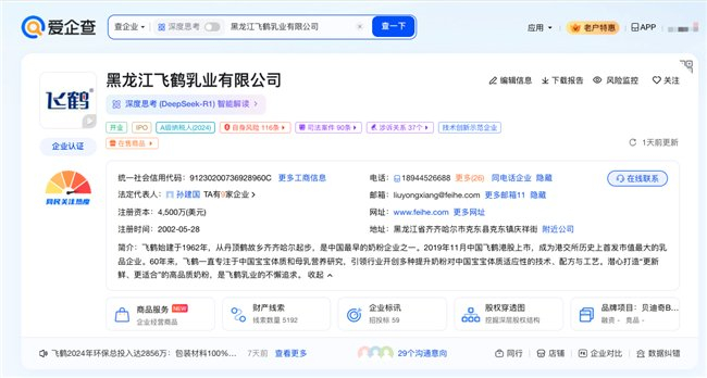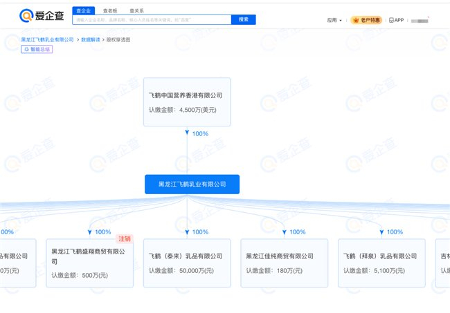 爱企查APP显示,飞鹤所属企业为黑龙江飞鹤乳业有限公司,该公司注册资本为4500万美元,法定代表人兼总经理为孙建国。