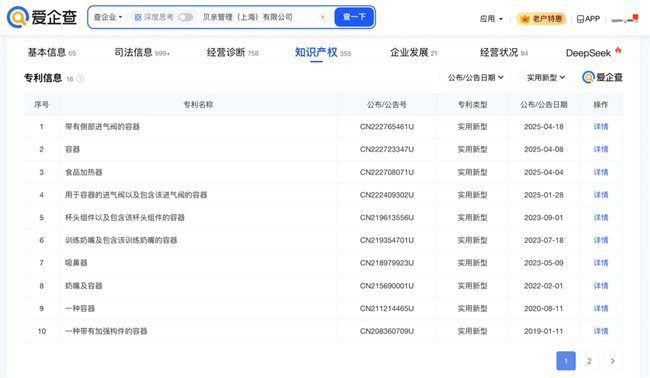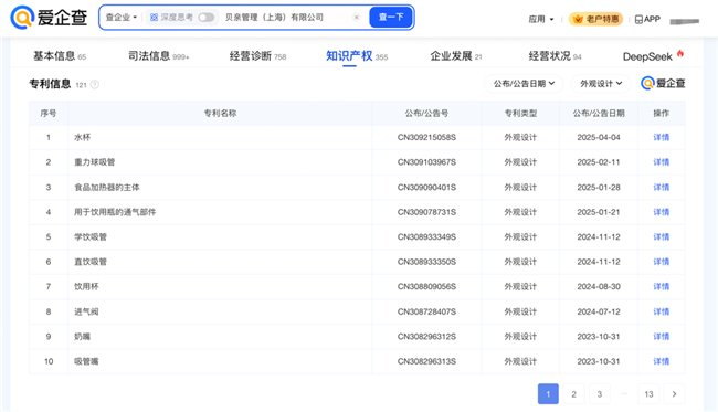 爱企查专利信息显示,贝亲管理(上海)有限公司已申请专利157项,其中包括外观设计专利121项,发明专利20项,实用新型专利16项,彰显了贝亲在母婴用品领域的深厚技术底蕴和持续创新能力。