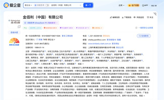 爱企查APP显示,金佰利(中国)有限公司注册时间为1998年1月,注册资本达8,431.964万美元。主营产品包括护肤或保湿产品、女性卫生用品、沐浴用品、护肤品、面巾纸或手帕、婴儿卫生用品等。