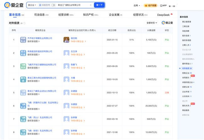 对外投资信息显示,黑龙江飞鹤乳业有限公司对外投资企业33家,截至目前22家处于存续状态。