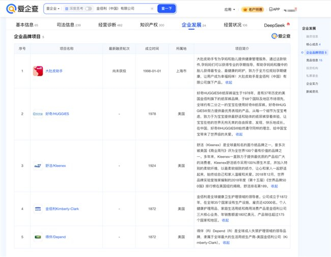 企业品牌项目信息显示,金佰利(中国)有限公司拥有品牌项目5条,分别为大肚皮助手、好奇、舒洁、金佰利、得伴。