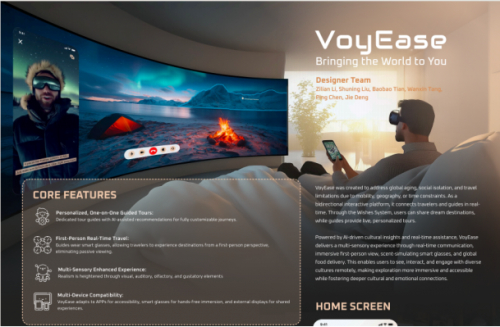 而由唐婉歆与团队共同研发的多平台沉浸式旅行系统VoyEase通过创新的双向交互平台,首次将实时第一视角导览、AI文化解读、嗅觉模拟与全球美食配送融为一体,彻底改变了远程旅行的体验模式。该系统允许用户通过智能眼镜或移动设备,以第一视角实时跟随导览员的镜头探索世界,同时借助AI驱动的嗅觉模拟技术和全球美食配送服务,实现了视觉、听觉、嗅觉与味觉的多感官同步体验。这种全感官沉浸式设计不仅填补了行业空白,更将虚拟旅行从“观看”提升至“参与”的全新高度,以"需求-响应"的交互范式开创了远程旅行新形态。