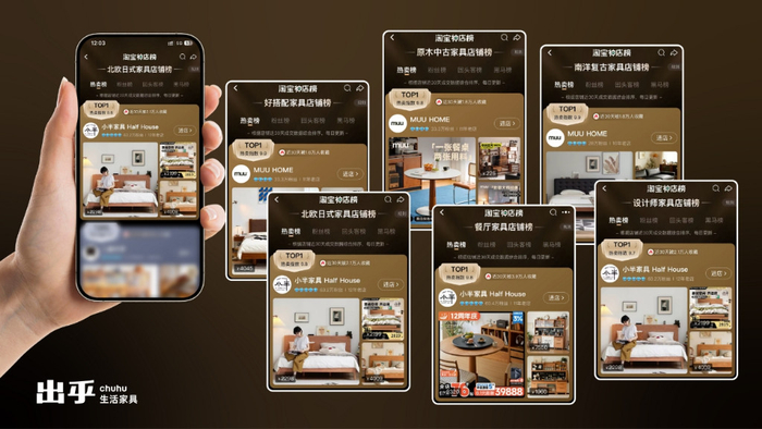 2012-2013年 出乎旗下的小半家具、muu home原创品牌进入电商行业,迅速占据家具市场前列 ,近年来发展势头大好,在淘宝跻身TOP商家行列。