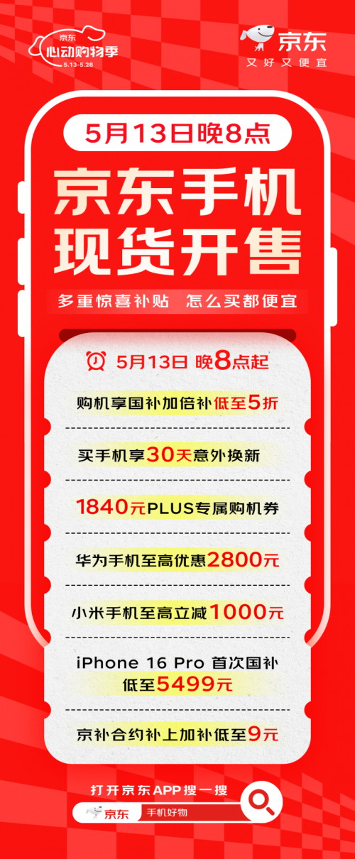 5月13日晚8点,京东心动购物季活动正式开启!为带给消费者又好又便宜的购物体验,京东携手厂商带来众多手机爆款产品与福利。来京东APP搜索“手机好物”,进入活动页面购手机可享多重优惠,包括购机享国补加倍补低至5折、买手机享30天意外换新、1840元PLUS专属购机券、华为手机至高优惠2800元、小米手机至高立减1000元等。此外,用国补购iPhone 16 Pro低至5499元,用“京补合约”下单可享补上加补低至9元购新机。
