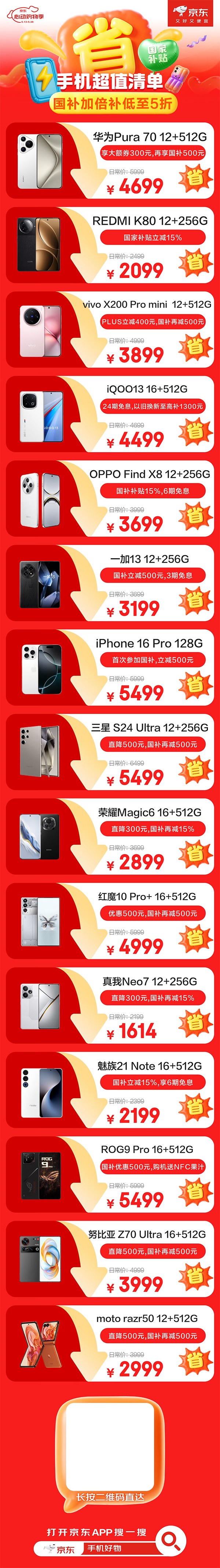 华为 Pura 70 12+512GB享大额券300元,再享国补500元,到手价4699元。REDMI K80 12+256GB享国家补贴立减15%,到手价2099元。vivo X200 Pro mini 12+512GB,PLUS会员立减400元,国补再减500元,到手价3899元。iQOO 13 16+512GB,到手价4499元,以旧换新至高补贴1300元。OPPO Find X8 12+256GB享国补补贴15%,到手价3699元。一加 13 12+256GB享国补立减500元,到手价3199元。iPhone 16 Pro 128GB首次参加国补,立减500元,到手价5499元。三星S24 Ultra 12+256GB直降500元,国补再减500元,到手价5499元。荣耀Magic6 16+512GB直降300元,国补再减15%,到手价2899元。红魔10 Pro+ 16+512GB优惠500元,国补再减500元,到手价4999元。真我Neo7 12+256GB直降300元,国补再减15%,到手价1614元。魅族 21 Note 16+512GB国补立减15%,到手价2199元。