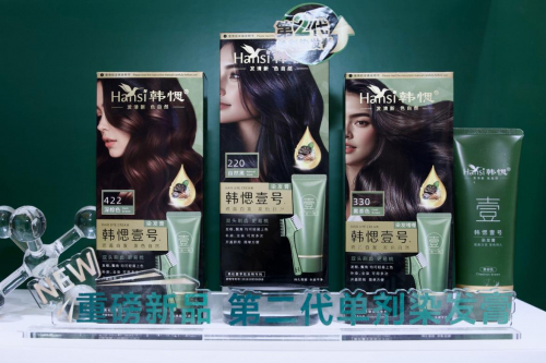 本次美博会,韩愢第二代单剂染发膏新品韩愢壹号,是基于一代单剂染发膏-韩愢果染膏的技术升级。在第一代单剂染发膏“韩愢果染膏”单剂配方的基础上,新品韩愢壹号在配方成分、工具革新及使用体验等维度升级革新: