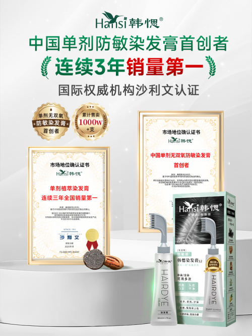 2021年,韩愢开创性推出首款单剂染发膏,通过AB剂型融合技术与无双氧配方革新,颠覆传统染发膏产品形态。该技术不仅消除了双氧和氨等刺激成分,更实现了"一剂完成染护"的便捷体验。其明星产品韩愢果染膏凭借独家温和配方,上市三年全网累计销量超1000万支,并荣获国际权威机构沙利文双重认证——"单剂无双氧染发膏首创者"及"单剂染发膏连续3年累计销量第一"的市场地位认证,引领居家染发健康新趋势。