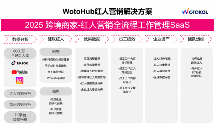 而WotoHub构建数据分析—建联红人—效果数据—员工绩效—企业资产—团队运维全链路闭环生态,正如设立系统初衷一样——链接全球意见领袖,助力中国品牌出海,通过降本、增效、精准的三重赋能,让出海企业实现全球化用户触达的范式升级。