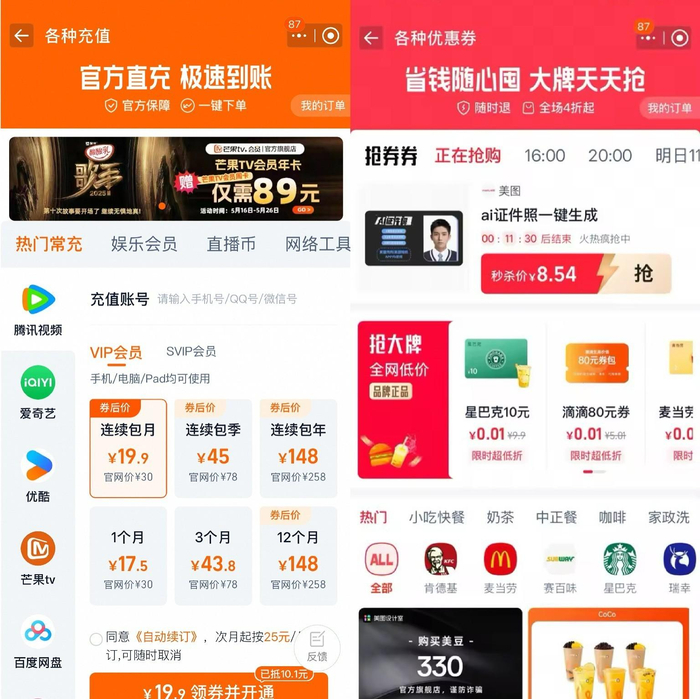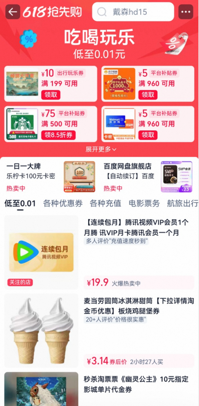 以影视会员、生活服务为代表的服务型消费在这个618 呈现爆发式增长,折射出消费者需求从“商品消费”向“体验消费”的结构性转变。618期间,上淘宝搜索“各种充值”、“各种优惠券”,诸如腾讯视频VIP年卡叠加补贴138元、LANNLIFE 泰式按摩60分钟338元、天真蓝肖像照299元等各种优惠等你解锁。