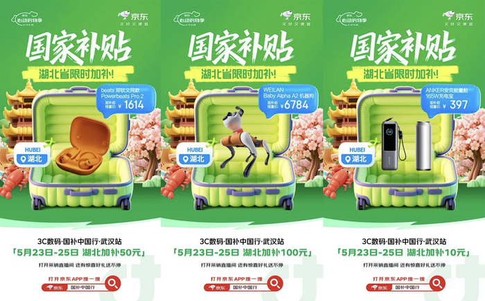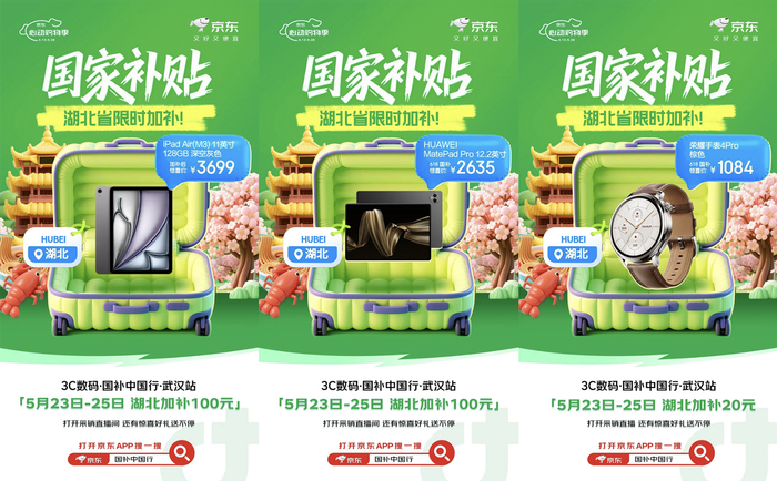 近日,京东心动购物季正在火热进行中,又好又便宜的京东618将于5月底正式开启。为让更多用户能够享国补换新机,京东开启“3C数码国补中国行”活动,5月23日至25日将落地湖北武汉,5月30日至6月3日将落地四川成都,6月11日至15日将落地浙江杭州,5月31日至6月15日将落地广东佛山。京东“3C数码国补中国行”活动将紧密结合四大城市当地特色,为当地消费者带来精彩纷呈的趣味活动,提供手机、电脑、数码爆品好物,现场下单更可享区域限时加补福利。消费者来京东APP搜索“国补中国行”进入活动页面或在活动现场扫码,购手机、电脑、数码享国补叠加多重补贴,4折起换新。