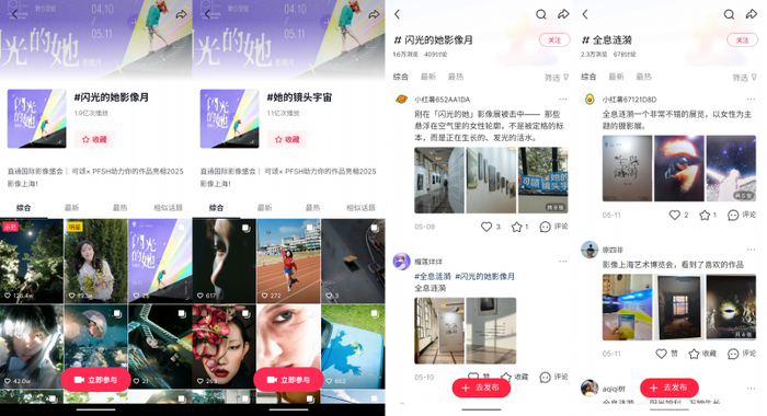 2025年4月,第十届影像上海艺术博览会前夕,抖音旗下拍照爱好者交流分享社区「可颂」与博览会联合发起「闪光的她」影像月,共同发掘闪闪发光女性影像和摄影师,联手多方行业资源助力女性影像作者实现摄影梦想,在国际影像盛会发声,挖掘摄影师的商业可能性。